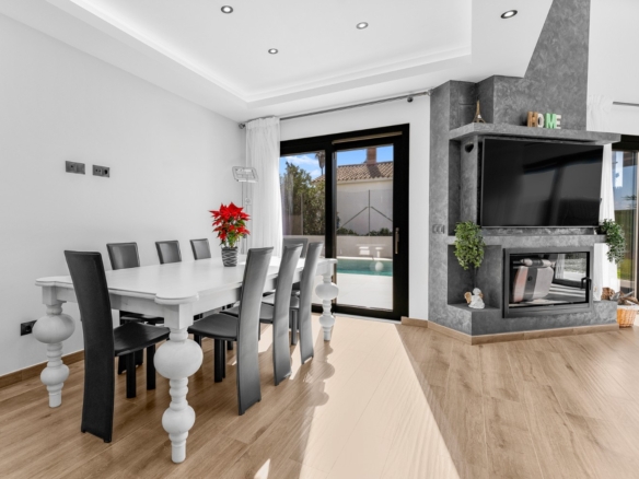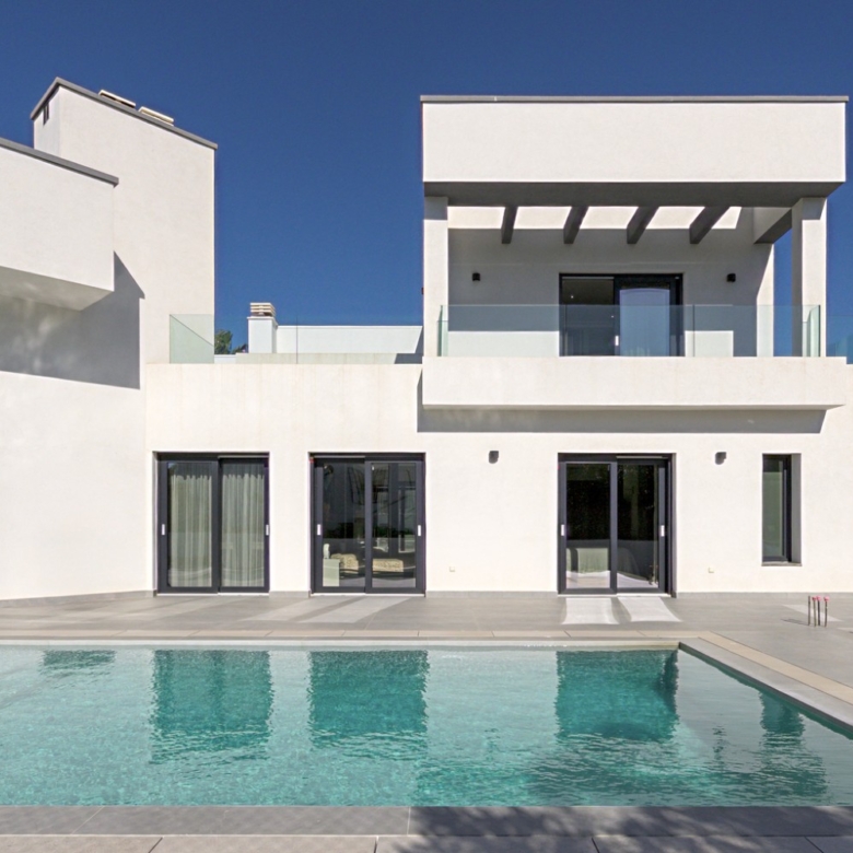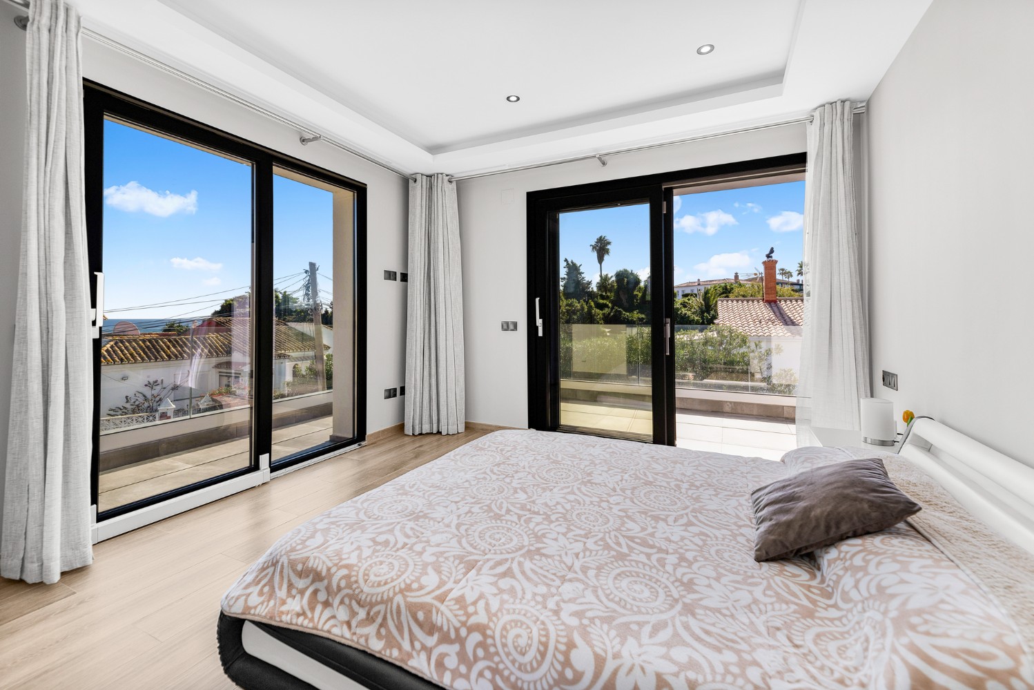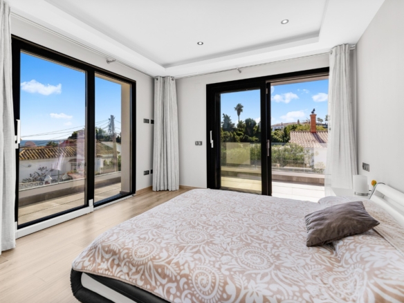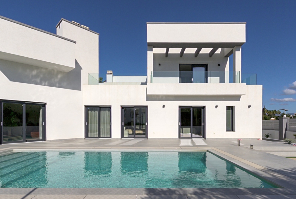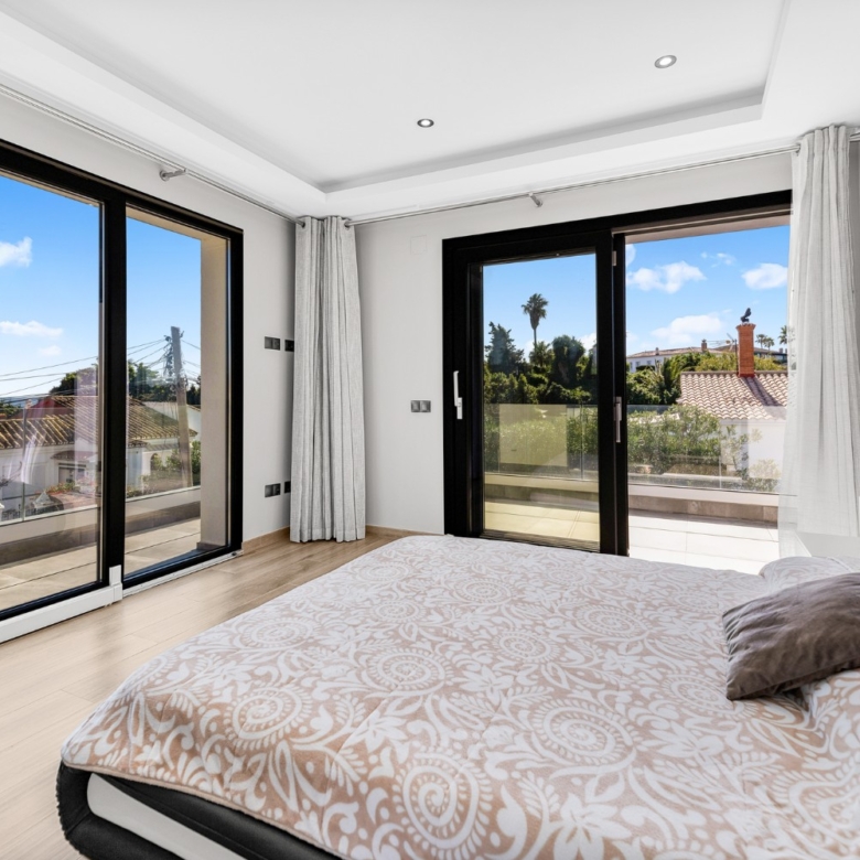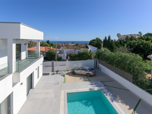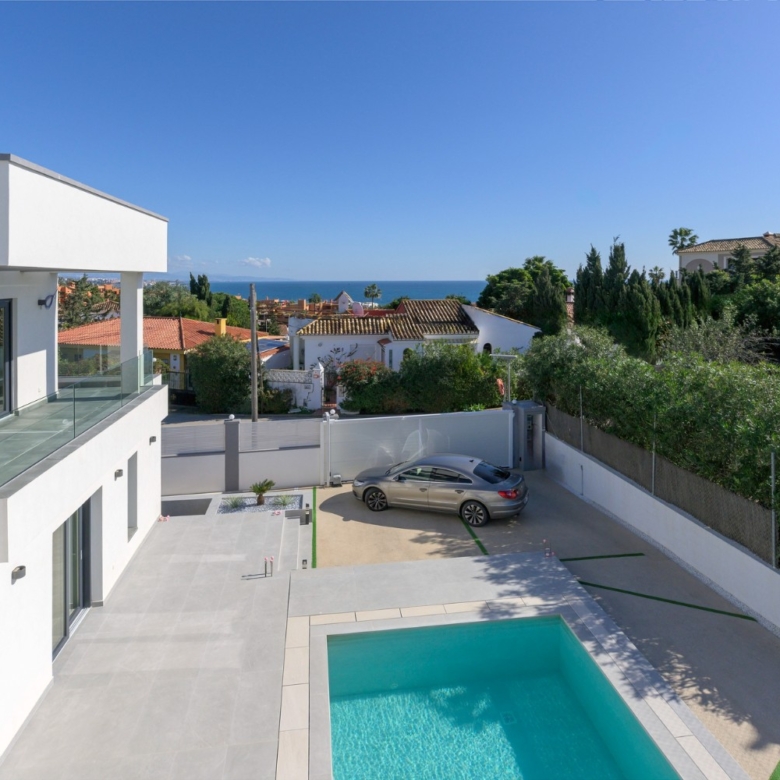 Situada en el prestigioso barrio de Buenas Noches, esta villa de nueva construcción ofrece vistas panorámicas al mar y a la montaña, a solo 500 metros de la playa y a minutos del vibrante corazón de Estepona.