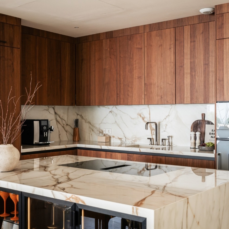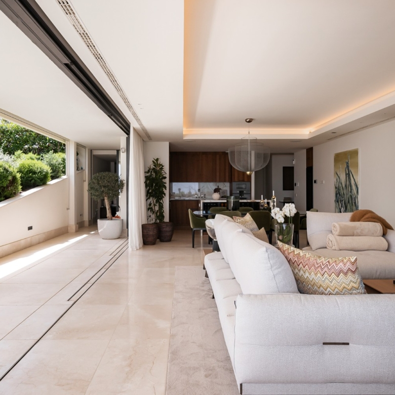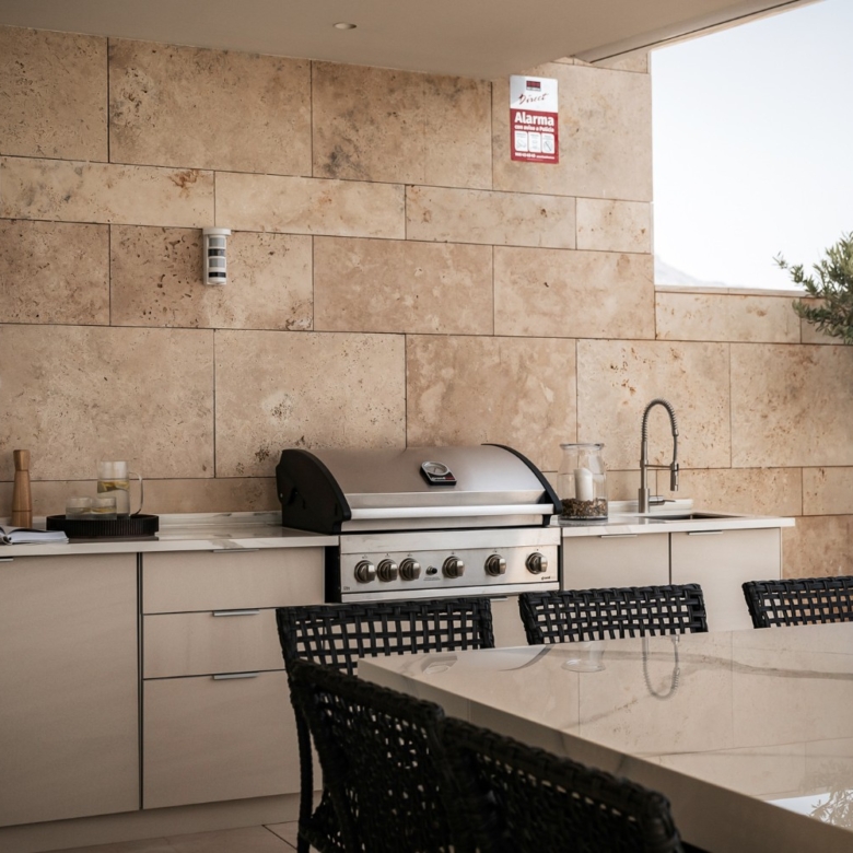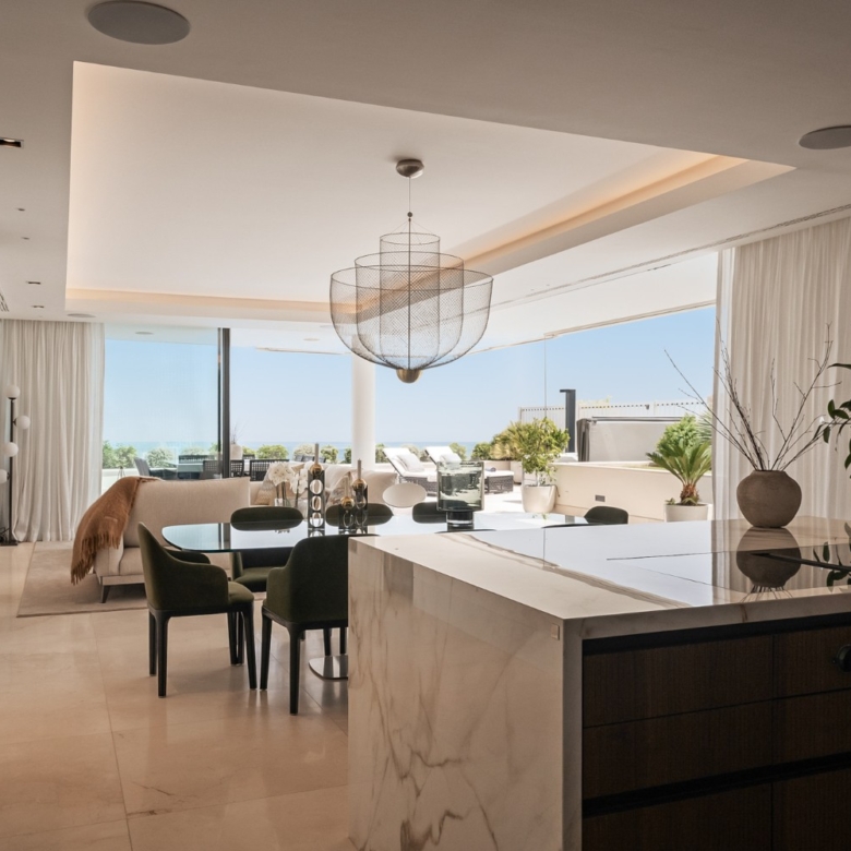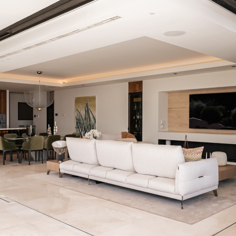 La distribución está cuidadosamente dividida por un pasillo central que separa los espacios sociales de los privados. La sala de estar de planta abierta cuenta con una elegante cocina equipada con electrodomésticos Gaggenau y Miele, una impresionante vinoteca de suelo a techo y ventanas totalmente automáticas que se abren por completo para integrar el interior con el exterior. Este espacio se integra con una espaciosa terraza en forma de L con vistas panorámicas al mar, que ofrece múltiples zonas para relajarse, comer y disfrutar. Un jacuzzi, una ducha exterior y una cocina de verano totalmente equipada se encuentran rodeados de un exuberante paisaje que crea la atmósfera de una villa privada.