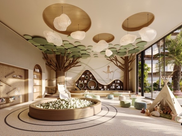 Áreas recreativas: Acceso al Parque Yas, con pistas para correr, senderos para bicicletas y áreas de juegos infantiles.
