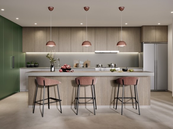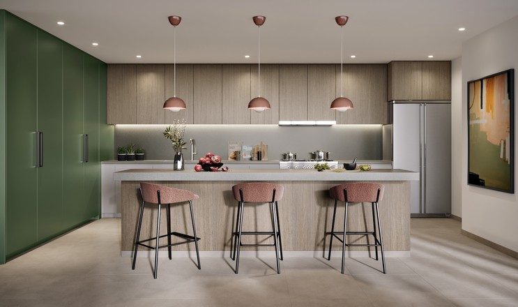 Cocina abierta elegante y moderna con acabados de alta gama.