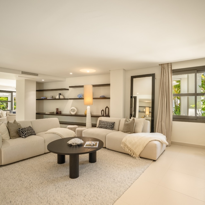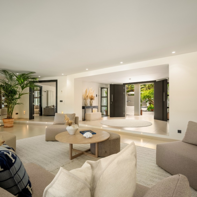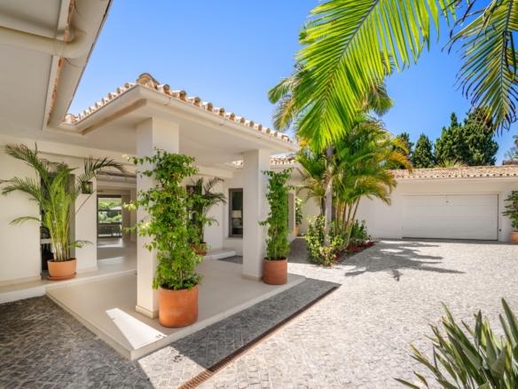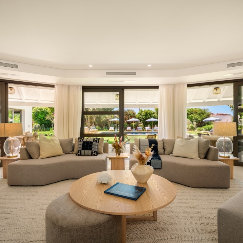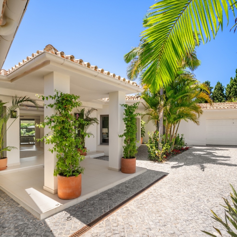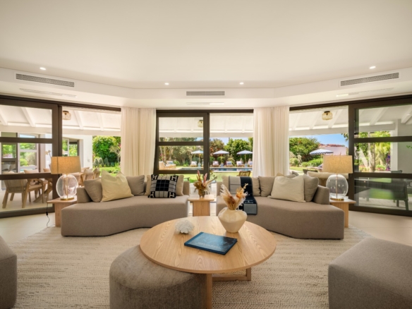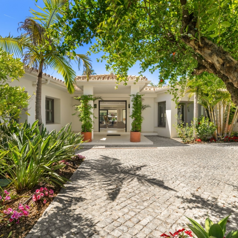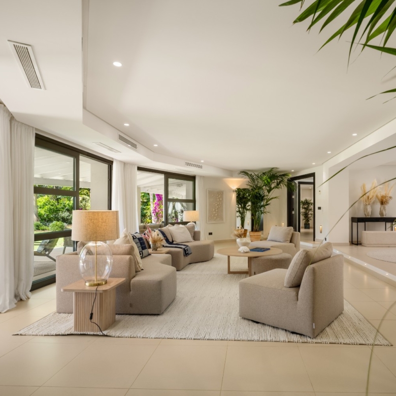 Este exquisito bungalow con orientación sur se encuentra en la prestigiosa zona de La Cerquilla, en Nueva Andalucía, y ofrece vistas parciales al campo de golf y sol todo el año. Ubicado en una parcela llana de 3,062 m² con 603 m² de superficie construida, la casa de una sola planta ofrece una perfecta integración entre el interior y el exterior y acceso directo al jardín desde todos los dormitorios.