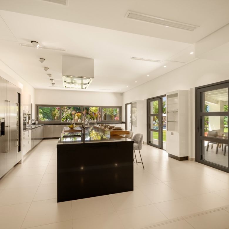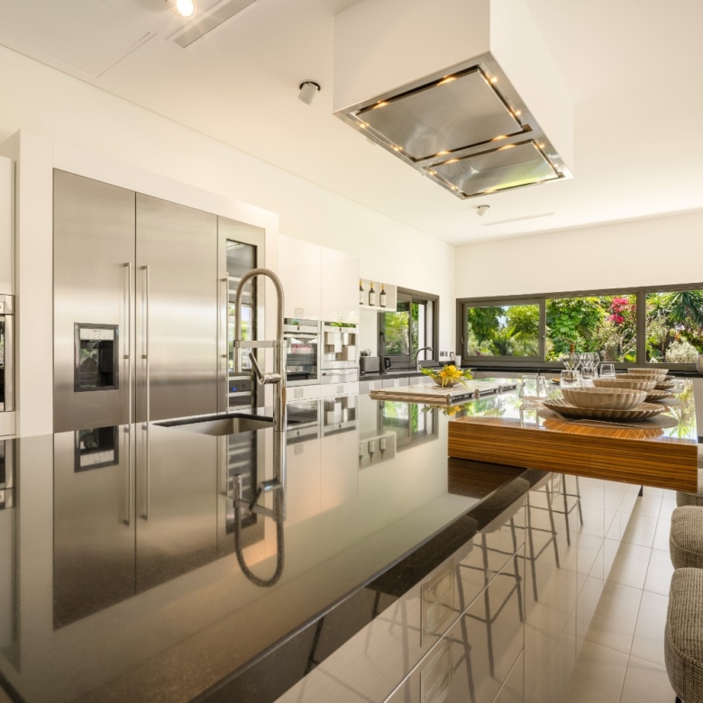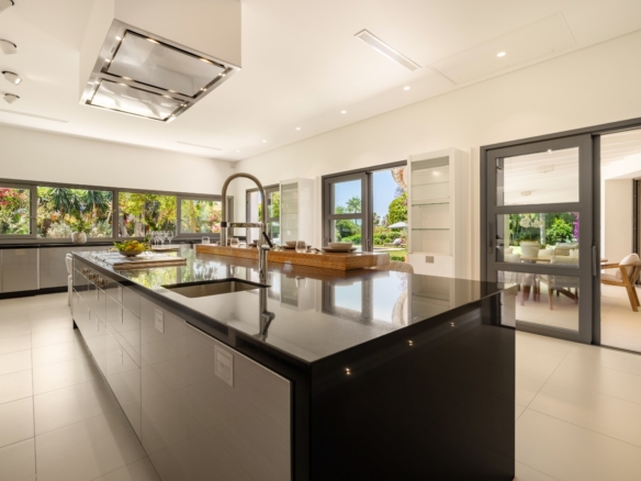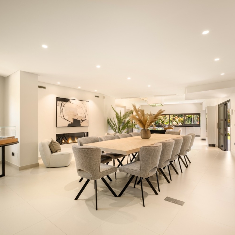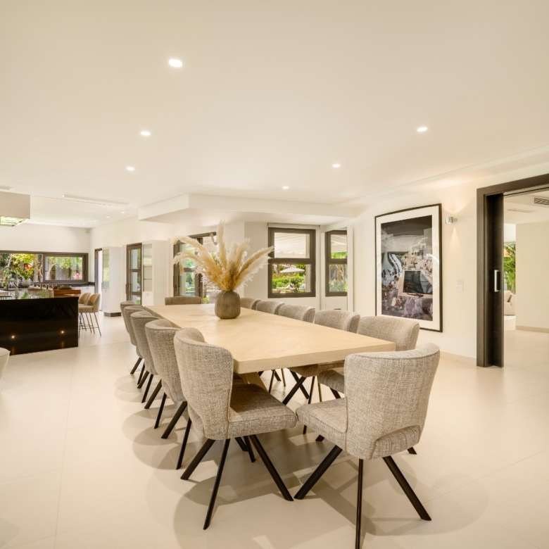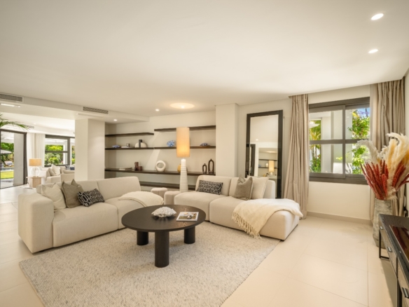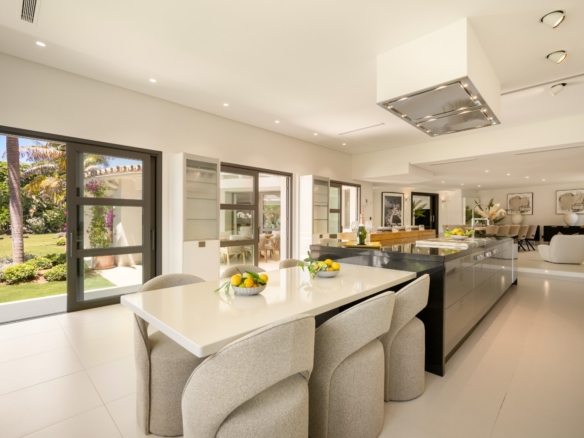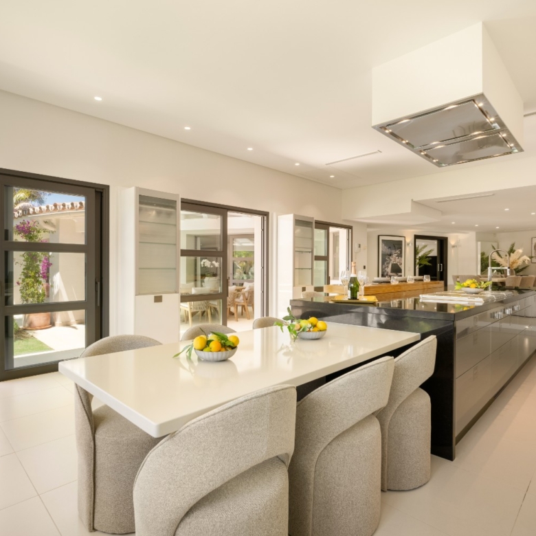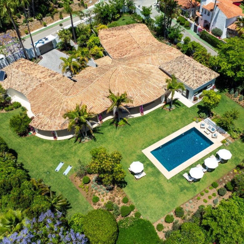 Este exquisito bungalow con orientación sur se encuentra en la prestigiosa zona de La Cerquilla, en Nueva Andalucía, y ofrece vistas parciales al campo de golf y sol todo el año. Ubicado en una parcela llana de 3,062 m² con 603 m² de superficie construida, la casa de una sola planta ofrece una perfecta integración entre el interior y el exterior y acceso directo al jardín desde todos los dormitorios.
